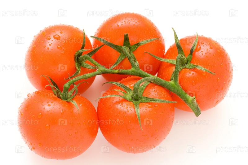 Ветка с пятью красными, спелыми помидорами на белом фоне