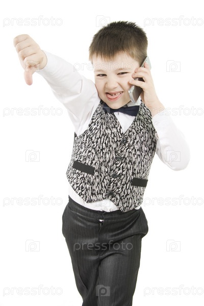 Маленький мальчик в жилетке с бабочкой разговаривает по сотовому, показывает язык и держит большой палец вниз. Белый фон