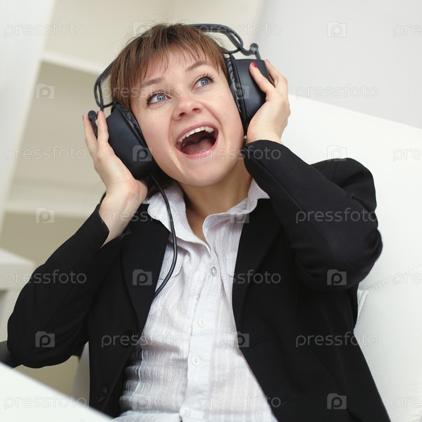 Веселая женщина с большими стерео наушниками на голове
