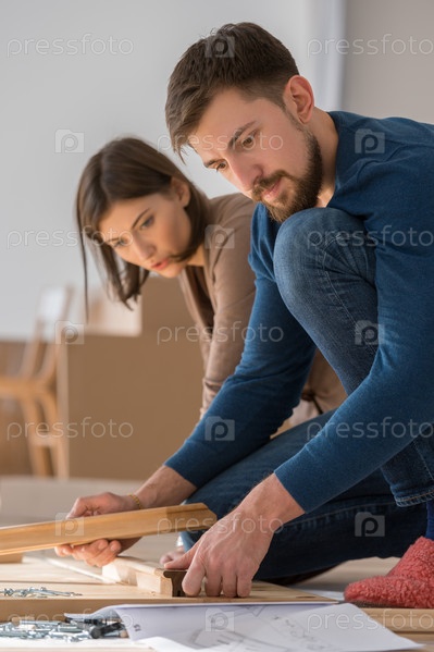 Пара собирает мебель