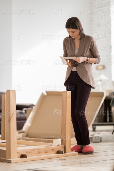 Женщина собирает новую мебель