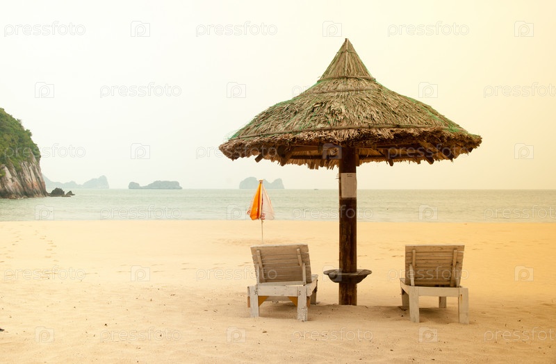 Морской пляж с двумя лежаками