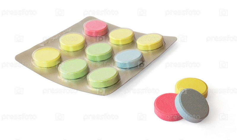 Разноцветные таблетки на белом фоне