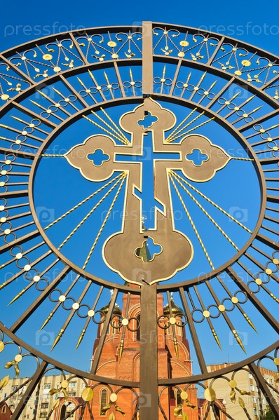 Православная церковь на фоне голубого неба. На переднем плане кованые ворота с крестом