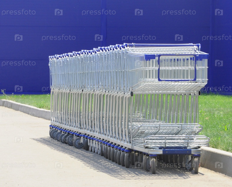 Ряд белых тележек перед торговым центром