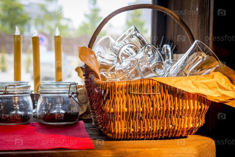 Корзина с пустыми бокалами на кухонном столе