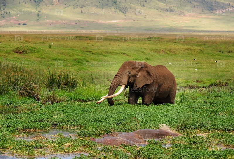 Слон с большими бивнями в болоте на фоне природы