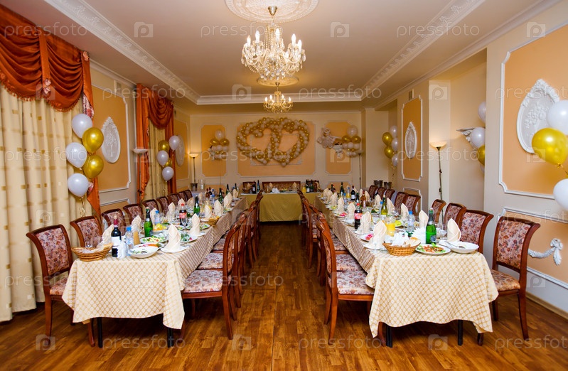 Зал ресторана, украшенный для свадьбы