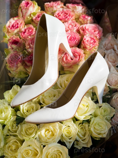 Свадебные туфли на фоне букета роз