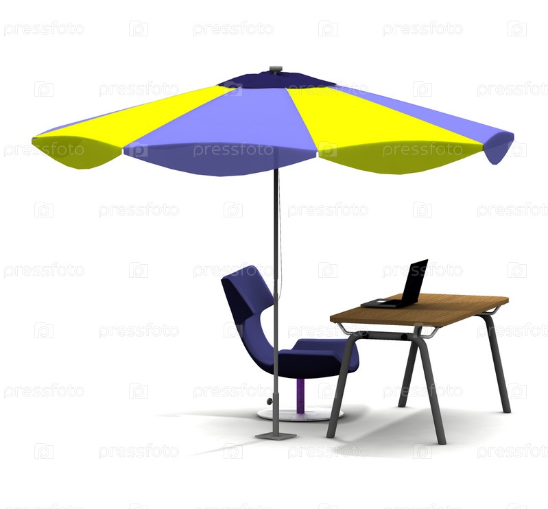 Стол с ноутбуком и стулом под шезлонгом на белом фоне