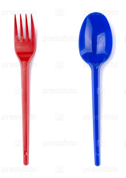 Пластмассовые вилка и ложка на белом фоне