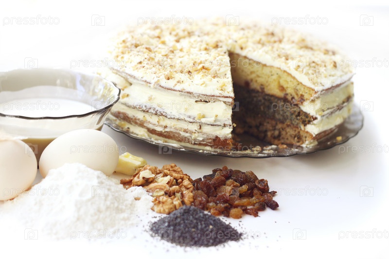 Торт и кулинарные ингредиенты на столе