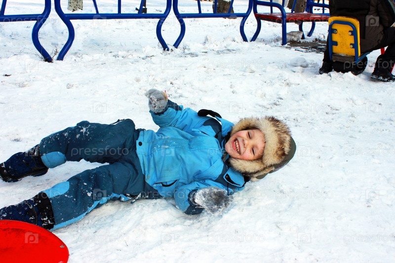 Смеющийся мальчик лежит на снегу