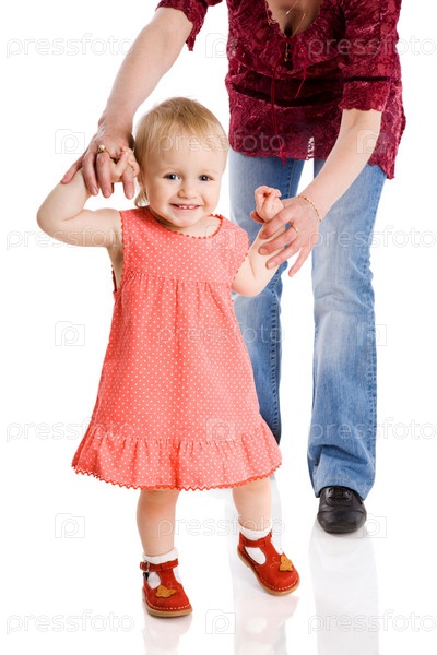 Счастливая мать держит за руки маленькую дочь на белом фоне