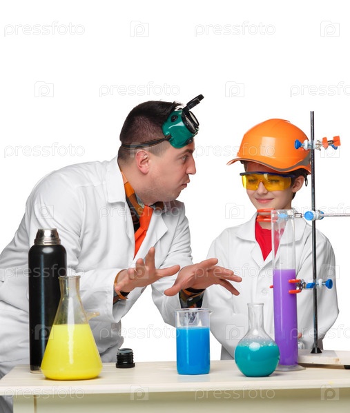 Подросток и учитель химии на уроке делать эксперименты