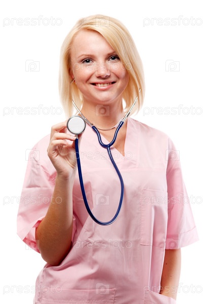 Женщина-доктор в халате со стетоскопом на белом фоне