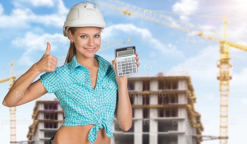 Молодая женщина в каске держит калькулятор