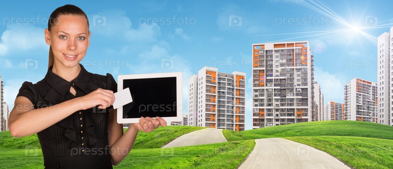 Молодая женщина держит планшет и карточку