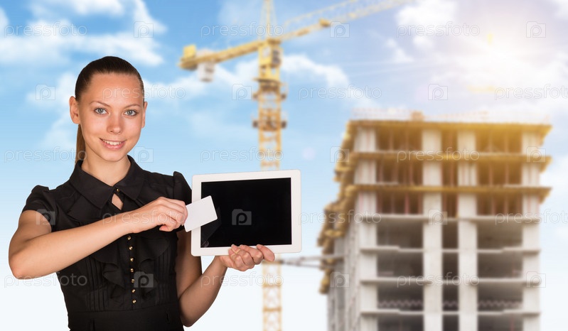 Молодая женщина держит планшет и карточку
