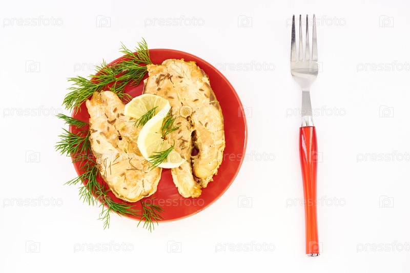 Тушеная рыба на красной тарелке