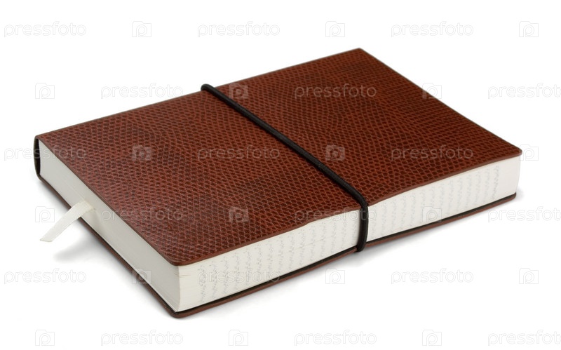 Коричневый кожаный ежедневник, перетянутый черной резинкой, изолированный на белом фоне