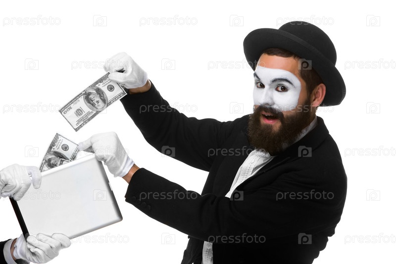Бизнесмен в образе мима на белом фоне