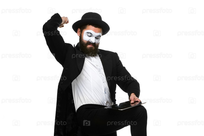 Бизнесмен в образе мима на белом фоне