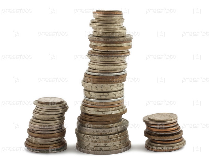 Три горки старинных монет на белом фоне