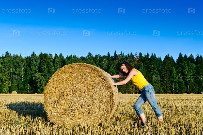 Девушка, катящая стог сена