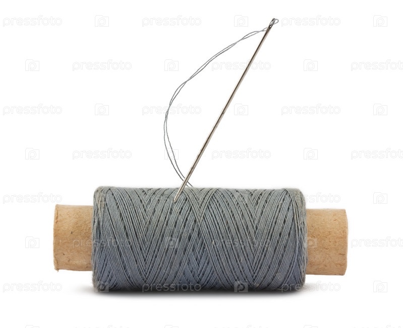 Катушка серых ниток с иголкой на белом фоне