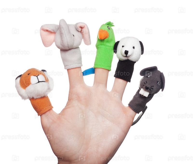 Пять игрушек, одетые на пальцы на белом фоне
