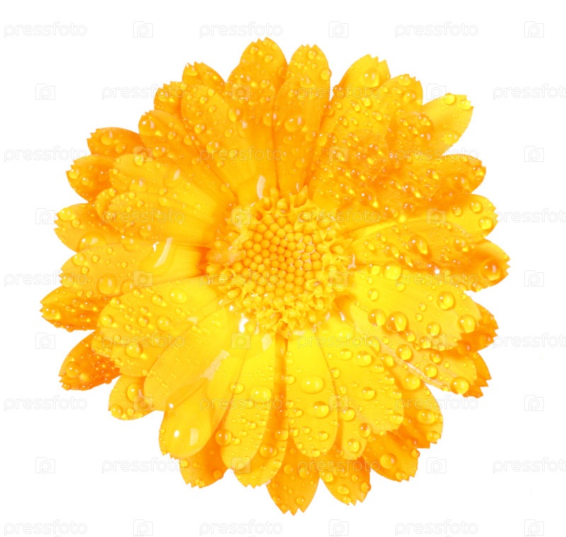 Желтый цветок календулы в каплях росы на белом фоне