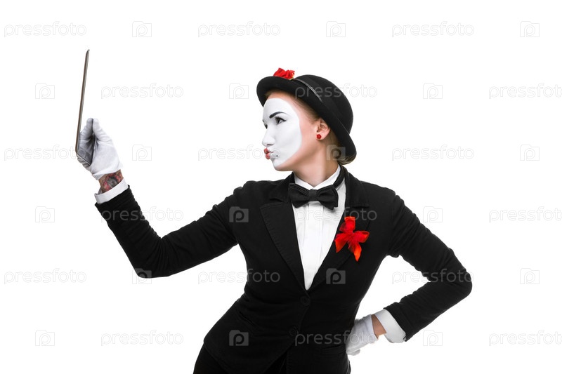 Мим держит планшетный ПК