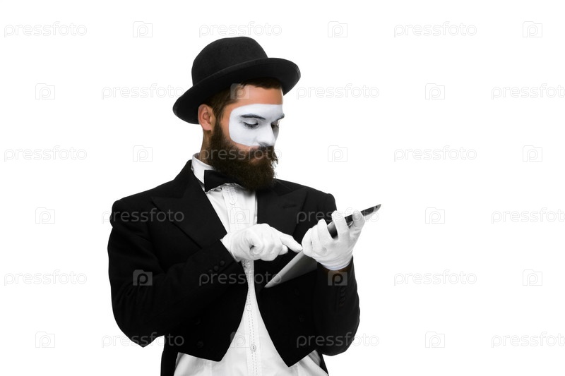 Мим держит планшетный ПК