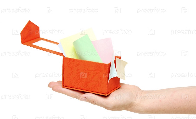 Красная коробочка с разноцветными листочками в руке