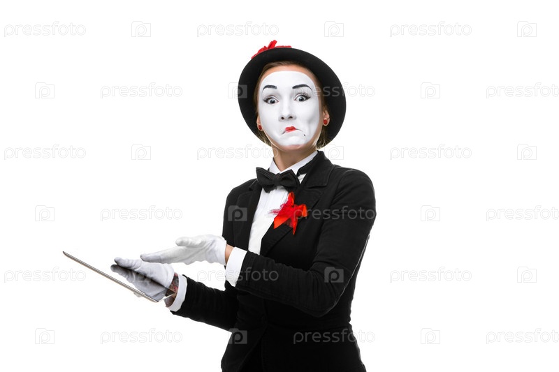 Мим держит планшетный ПК