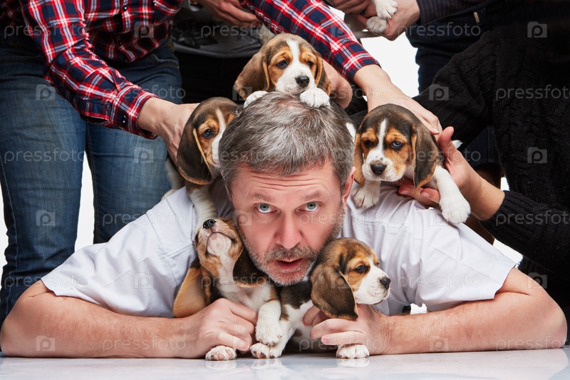 Мужчина с несколькими щенками бигля