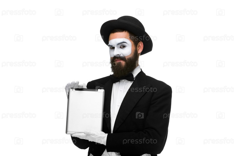 Мужчина в образе мима с планшетом