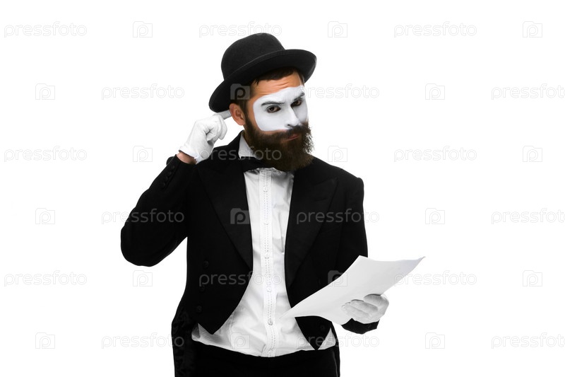 Мужчина в образе мима читает с листа