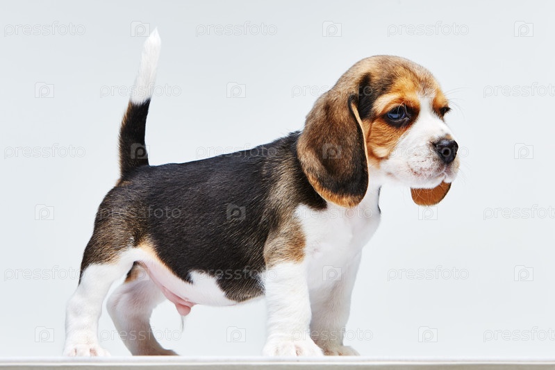 Щенок породы бигль на белом фоне