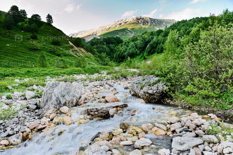Красивый горный ручей на фоне гор Северного Кавказа
