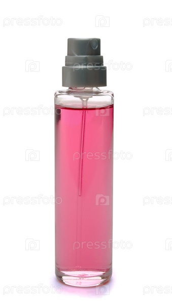 Розовый флакон духов на белом фоне