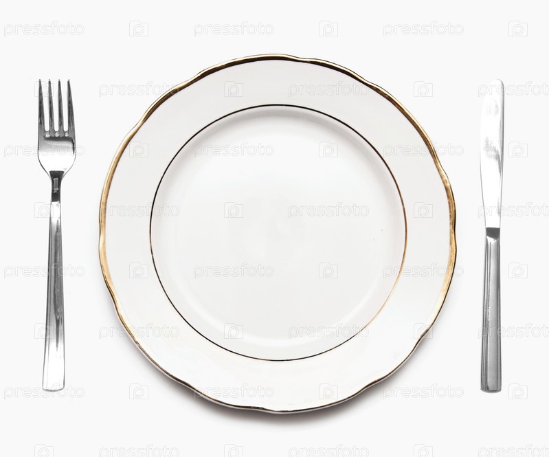 Нож, вилка и белая тарелка на белом фоне