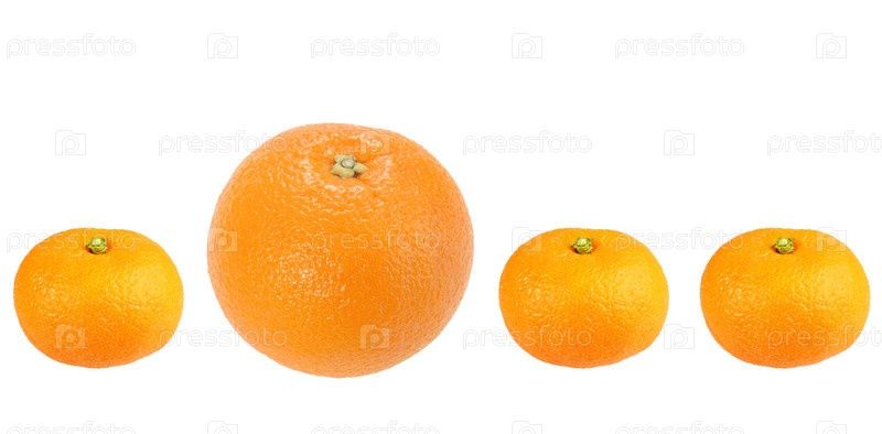 Апельсин и мандарины в ряд, изолированные на белом фоне