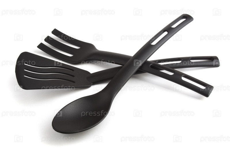 Пластиковая ложка, лопатка и вилка на белом фоне