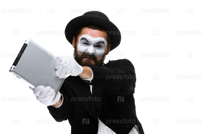 Мужчина в образе мима с ноутбуком