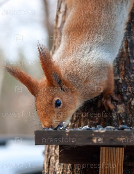 Евразийская белка грызет семечки