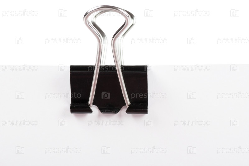 Черная скрепка на белой бумаге. Макро съемка. Белый фон