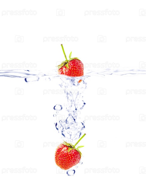Клубника падает в воду на белом фоне