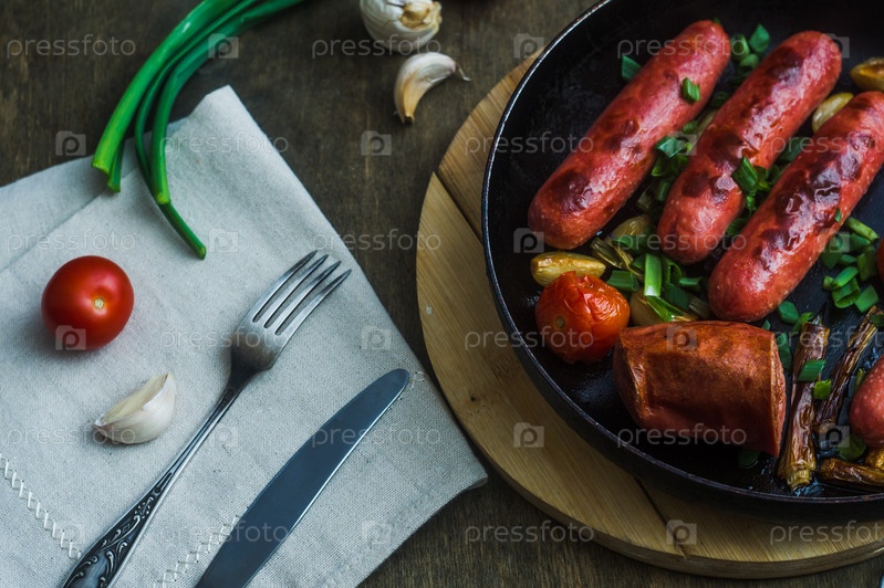 жареные колбаски с овощами на сковороде